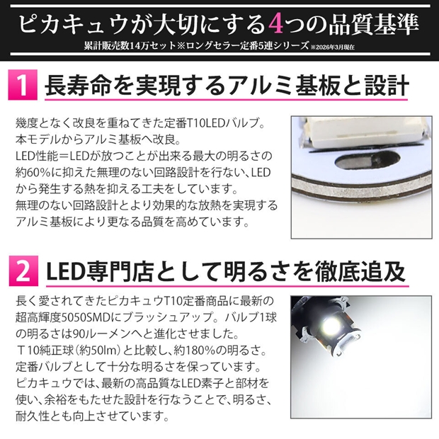 お客様に長く愛されてきたピカキュウの定番T10ウェッジバルブを最新超高輝度5050SMDにブラッシュアップしました。使い勝手の良い定番LEDバルブながら、1球の明るさは90ルーメンを実現しています。