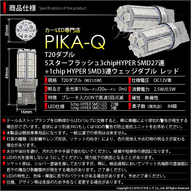 | 商品名 | T20ダブル 5STAR FLASH HYPER SMD 30連ダブルウェッジ球 LEDカラー:レッド 1セット2個入り【競技車専用】 | |||