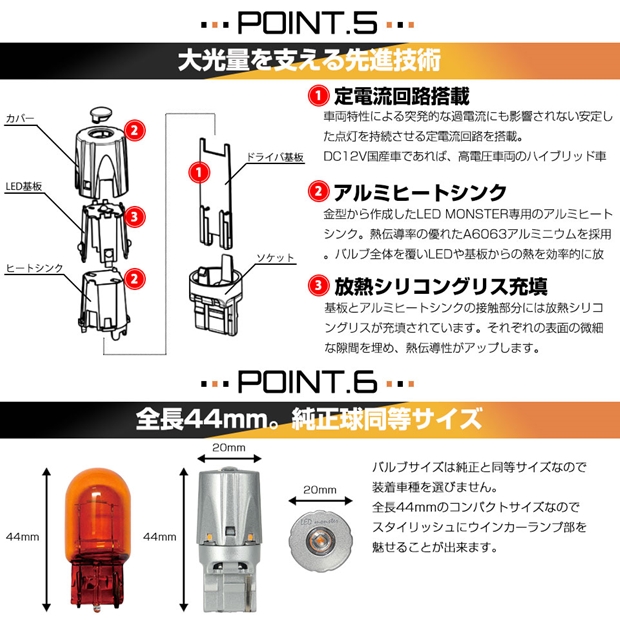 最高峰の明るさ550lm 全方向に美しく照射するキレのあるウインカー点滅を実現。明るさは純正白熱球と比較して約2倍の明るさ。 LUMILEDS製 超高効率LED搭載 LED素子は2mm×2mmの極小サイズでハイスペックを誇る超高効率LEDを5個搭載。バルブ1球で明るさ550ルーメンを実現しています。 被視認性を高める プロジェクターレンズ バルブトップは集光レンズを搭載し、照射光をより遠くへ放ち、4側面から放たれる照射光は効率よくリフレクターに反射し、全方向照射で死角の無い配光を生み出しています。 リフレクターに溶け込む 高ステルスバルブ (1)2mm×2mm極小サイズの超高効率LED搭載 バルブ装着時のステルス性を高めるため高出力で蛍光体が極力小さいLEDを選択。クリアレンズ車両への装着時にLED素子のオレンジ色の映り込みを最小限に抑えることが出来ます。 (2)設計をミリ単位で突き詰め、LED基板を見せない工夫 ステルス性を高めるためにLEDを実装している基板部分ができるだけ目立たないように工夫を施しています。 設計寸法をミリ単位で調整修正しています。 (3)美しい光沢のあるバルブボディ コーティング加工を施し美しい光沢のあるバルブボディに仕上げました。装着時はリフレクターに溶け込むような圧倒的ステルス性能を実現しています。 (4)純正同等サイズ、全長44mm バルブサイズは純正とほぼ同等サイズなので装着車種を選びません。スタイリッシュなバルブデザインなのでウインカーランプ部をスマートに魅せることが出来ます。 大光量を支える 先進の放熱技術 (1)放熱効果が高いバルブ構造と高品質部材を使用 高い耐久性を保持し、LED性能を十分に引き出すため、放熱性能を徹底追及しています。 設計・部材をさらにブラッシュアップし長期間の使用に耐える高品質なバルブを仕上げました。 (2)オリジナル設計のアルミヒートシンク 完全オリジナルデザインの放熱効果を最大限に高めるアルミヒートシンク。その中でも熱伝導性に優れたA6063 アルミニウムを使用。バルブ全体を覆いLED及び基板から発生する熱を効率的に放熱します。 (3)放熱シリコングリス充填 LED基板とアルミヒートシンクの接触部分に放熱シリコングリスを充填。基板表面の微細な隙間を埋めることで熱伝導性を高め放熱効果を向上させます。 (4)定電流回路搭載 車両特性による突発的な過電流に影響されない安定した点灯を持続させる定電流回路を内蔵。DC12V国産車であればHV、PHV、EV等様々な車両に装着可能です。 |