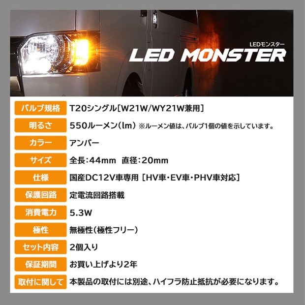 スズキ ワゴンR スティングレーハイブリッド[MH55S]対応 ウインカーランプ用LEDバルブ (フロント・リア対応) LED MONSTER 550lm LEDウインカーバルブ 明るさ:550lm 色:アンバー バルブ規格:T20シングル[WY21W/W21W兼用] 1セット2個入 |