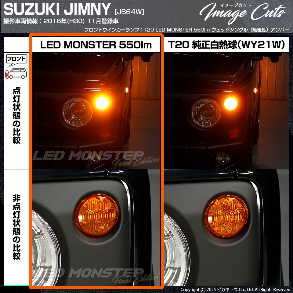 ピカキュウ,LED専門店ピカキュウ,LED,ウインカー球,オレンジ球,ウインカーラン,ターンシグナルランプ,ハザードランプ,LED MONSTER,LEDモンスター,t20,T20シングル,ウェッジ球,wy21w,w21w,WY21W,W21W,オレンジ,アンバー,橙,スズキ,ジムニー,SUZUKI,JIMNY,JB64W