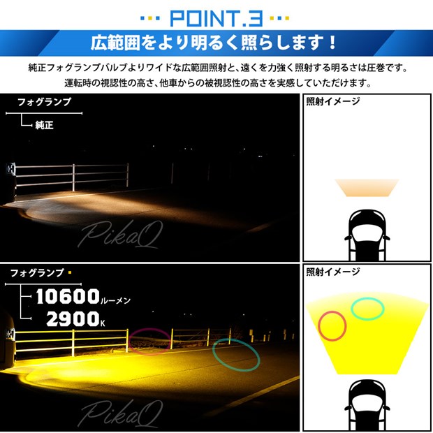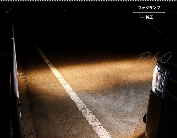 純正フォグランプバルブをよりワイドな広範囲照射と、遠くを力強く照射する明るさは圧巻です。運転時の視認性の高さ、他車からの被視認性の高さを実感していただけます。