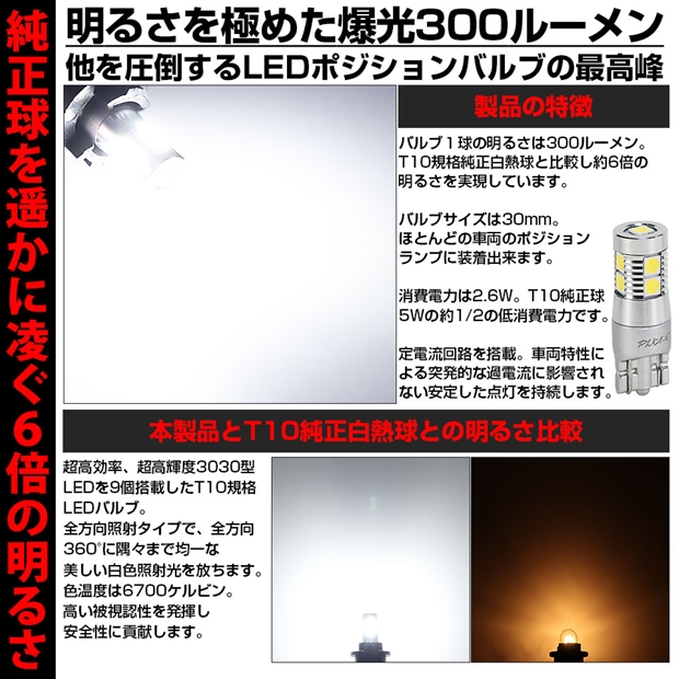 バルブ1球の明るさは300ルーメン。T10規格純正白熱球と比較し約6倍の明るさを実現しています。
