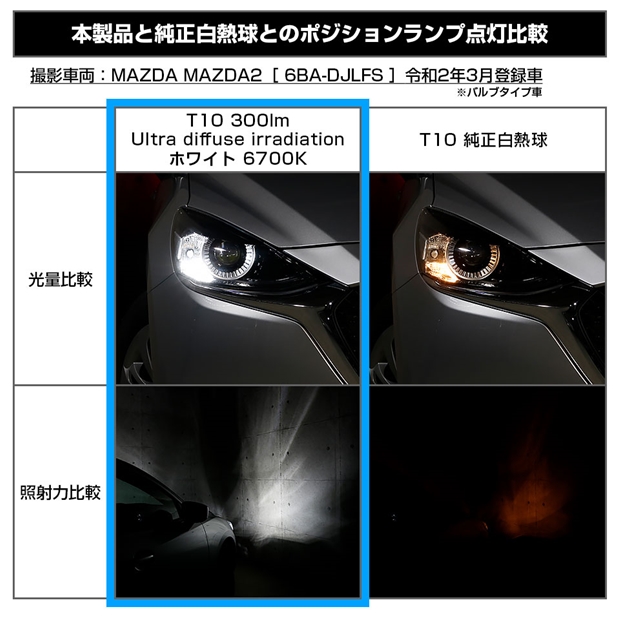 バルブ1球の明るさは300ルーメン。T10規格純正白熱球と比較し約6倍の明るさです。