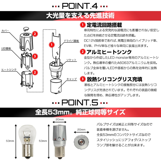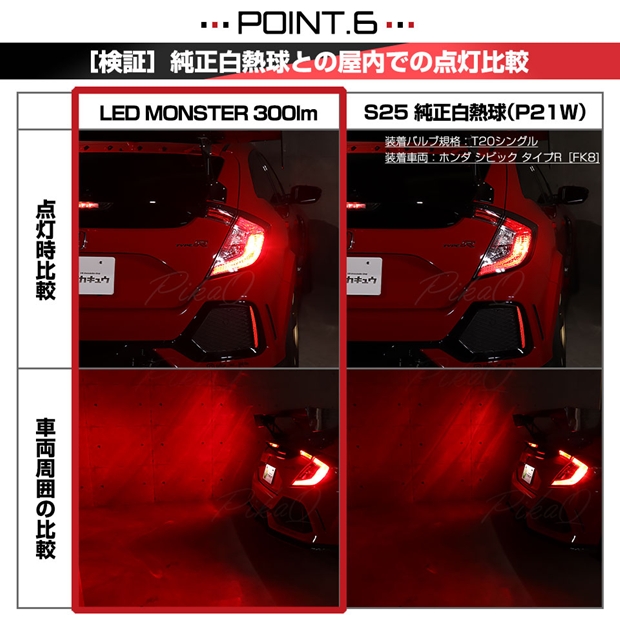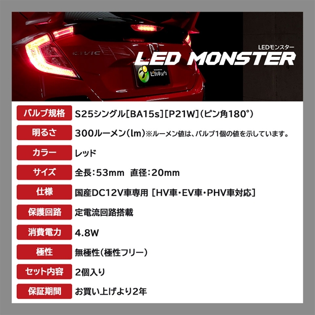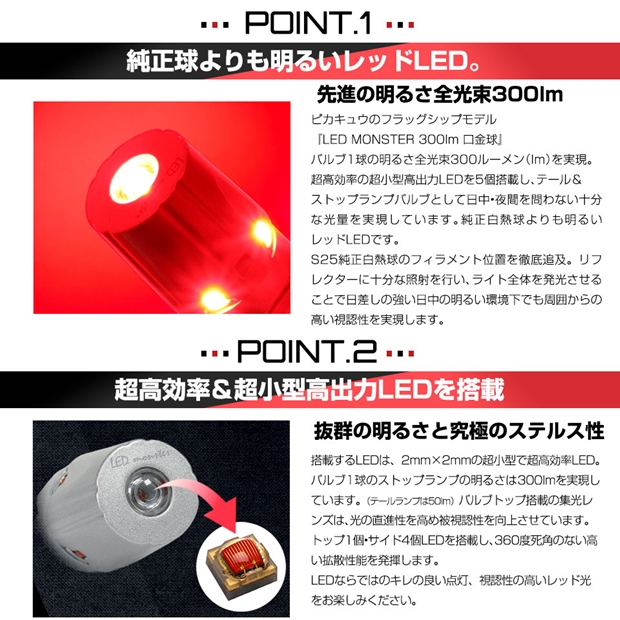 ピカキュウ,LED専門店ピカキュウ,LED,リアフォグランプ,ストップランプ,LED MONSTER,LEDモンスター,s25,S25シングル,ピン角180°,ba15s,p21w,赤色,レッド