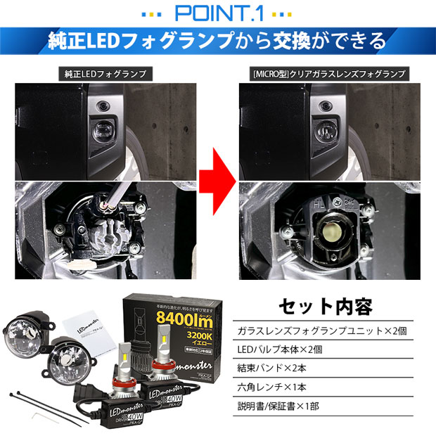 ダイハツ純正LEDフォグランプ装着車対応 Eマーク [MICRO型]クリアガラスレンズフォグランプユニット付 LED MONSTER L8400 LEDフォグランプキット 全光束:8400lm LEDカラー:イエロー 3200K バルブ規格:H11(H8/H11/H16共通) |