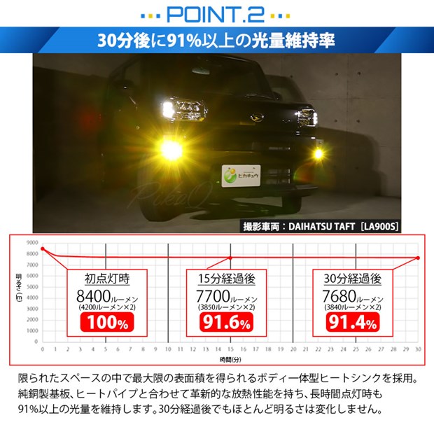 最強の明るさ8400ルーメン 55W ハロゲンランプの明るさ2200lm(※1)を超える十分な光量です。 全光束8400ルーメン(※2)、最強のモンスター級フォグランプ用LEDバルブキットです。 (※1)自社調べ (※2)ルーメン値は、左右バルブ2個(車両一台分)の合計値を示しています。 30分後に91%以上の 光量維持率 放熱性能が高いため、長時間点灯後も91%以上の光量を維持します。30分経過後でもほとんど明るさは変化しません。 抜群の配光特性 ガラスレンズフォグランプユニットの高い路面照射精度とLEDバルブの高配光性能で、確実に路面を広範囲に照射します。 LEDバルブは最新の超小型パワーLEDを搭載。 純正球の配光特性に徹底的にこだわり、純正バルブのフィラメントと中心を合わせた同じ位置にLEDの発光源を設定。LEDが実装された基板の厚みはわずか2mm。理想的な配光を実現しています。 全品、加圧空気検査 防塵・防水性能 IP67が満たされているか加圧空気にて全品検査を行っています。 浸水の原因となるレンズと灯体の隙間を確実に見つけ出すことができるので不良品の出荷はありません。 取付け時にレンズと灯体の継ぎ目にコーキング加工等をすることなく、そのまま装着することができます。 進化した放熱システム 銅基板、ヒートパイプ、ボディ一体型ヒートシンクにより放熱性能が大幅アップ! LEDで発生した熱を効率よく放熱します。 1)純銅製基板 LEDを実装した極薄純銅製基板。LEDで発生した熱を素早く取り込みヒートパイプに伝えます。 2)純銅製ヒートパイプ 空洞で真空密閉されたヒートパイプ。銅板よりも熱伝導性に優れ、銅製基板の熱をヒートシンクに素早く確実に伝えます。 3)ボディ一体型ヒートシンク ヒートシンクは表面積が大きいほど冷却スピードが向上します。限られたスペースの中で最大限の表面積を得るため、ボディ一体型ヒートシンクを搭載。ヒートパイプから送られてくる熱を素早く放熱します。 4)高性能ファン 直径30mmの高性能ファンを搭載。ヒートシンクに大量の空気を当てて素早く熱を奪います。 サーマルシャットダウン機能 バルブに搭載したファンが故障しバルブの冷却ができなくなった場合や、動作周囲温度が設定値を超えた場合等の非常事態には出力を下げてLEDバルブや車両の破損を防ぎます。 また、定電流回路を搭載し突発的な車両電圧変化に影響されることなく安定した点灯を確保します。ハイブリッド車やEV車、PHV車にも安心してご使用いただけます。 品質への徹底した拘り 高品質にこだわり続けるピカキュウだからできる安心の2年保証。 ピカキュウでは、取り扱う全てのLEDバルブは、国内で徹底した品質検査を実施しております。初期点灯確認だけでなく連続点灯検査・電圧変動点灯検査、キズや色温度、凹みなどの目視検査を行なっています。製品毎に検査方法や検査時間は変わりますが、製品の合否判定まで約5時間から15時間をかけて検品検査を実施しております。 |