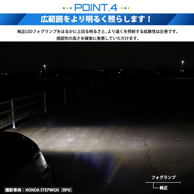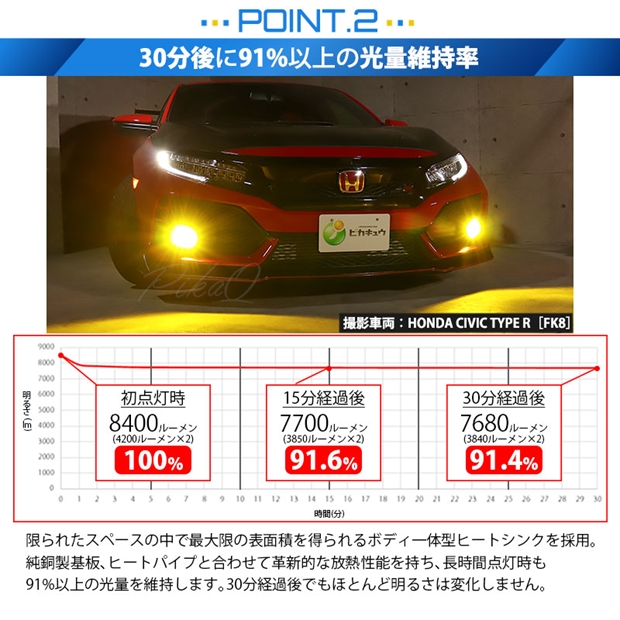 55W ハロゲンランプの明るさ2200lm(自社調べ)を超える十分な光量、全光束8400ルーメン、最強のモンスター級フォグランプ用LEDバルブです。放熱性能が高いため、長時間点灯後も91%以上の光量を維持します。30分経過後もほとんど明るさは変化しません。純正球の配光特性に徹底的にこだわり、純正バルブのフィラメントと中心を合わせた同じ位置にLEDの発光元を設定。理想的な配光を実現しています。 [1][ヒートパイプ構造]:熱伝導率が非常に高いヒートパイプを装備。 [2][熱伝導率の高い銅基板]:熱伝導率が高い極薄純銅製基板を採用。 [3][ボディ一体型ヒートシンク]:限られたスペースの中で最大限の表面積を得るため、ボディ一体型ヒートシンクを搭載。 [4][静音設計電動冷却ファンを搭載]:安定した放熱効果を発揮する30mm電動冷却ファン装備。 [5][サーマルシャットダウン機能を搭載]:バルブに搭載したファンが故障しバルブの冷却ができなくなった場合等の非常事態に出力を下げLEDバルブや車両の破損を防止。 [6][定電流回路搭載]:定電流回路を搭載し突発的な車両電圧変化に影響されることなく安定した点灯を確保します。 |