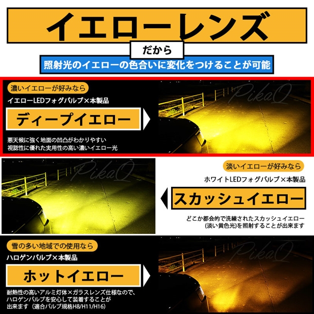 金型から設計したピカキュウオリジナルの幅細リフレクターにより抜群の配光を実現しています。イエローレンズは、装着するバルブカラーによりイエロー光の濃淡をつけることが出来ます。非点灯時も愛車の存在感をアピールします。 [1]イエローガラスレンズ仕様 [2]強固なタフボディ「アルミ製灯体」 [3]高い防塵・防水仕様「IP67」(全製品に加圧空気検査済) [4]配光調整機能搭載 [5]Eマーク認証製品 |