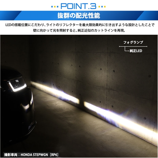 | 装着するバルブは光量の全光束8400ルーメン。リフレクター性能を最大限効果的に引き出すような設計で純正ハロゲンバルブ近似のカットラインを再現する「LED MONSTER フォグバルブ」 | |