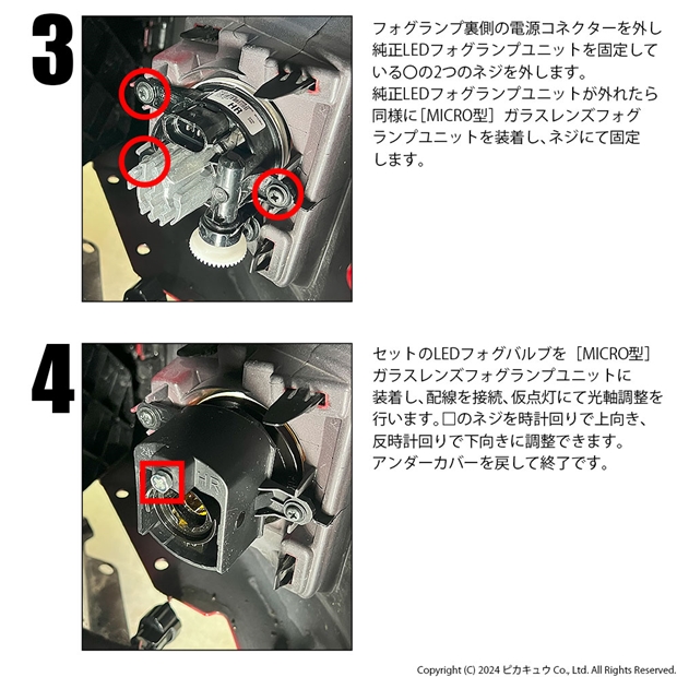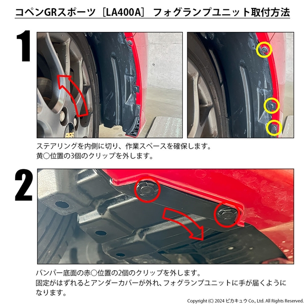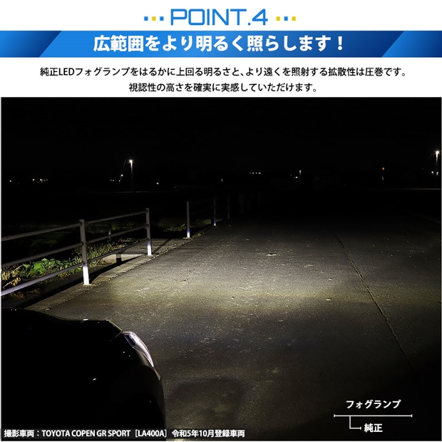 ◆フォグランプが装着されていない車両に取り付ける場合は、フォグランプスイッチやハーネスを別途ご用意いただいたり、バンパーの加工が必要になることがあります。 ◆バルブ取付時、バルブのパッキンが摩擦で変形することがあります。その場合フォグユニット内に水が浸入する恐れがあります。バルブ取付時にバルブを左右に数回捻り、パッキンを馴染ませてください。馴染みにくい場合はパッキンを濡れタオル等で湿らせ馴染ませてから取付してください。 ◆仕様やオプションによっては、純正フォグランプユニットが装着されていても、ステー等の形状が異なる場合や、フォグ後方スペースの問題で装着できない場合がございます。必ずご購入前に車両に装着されているフォグランプの形状、寸法をご確認ください。 [画像車両:コペン GRスポーツ 型式:3BA-LA400A 令和5年10月登録車両] |