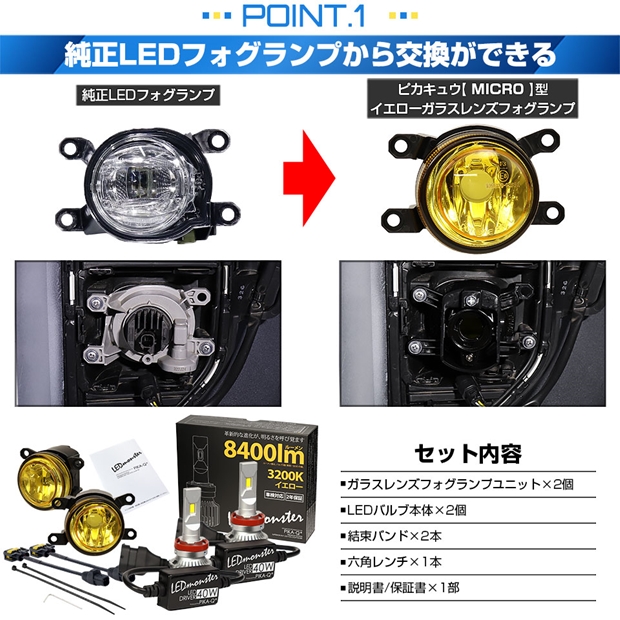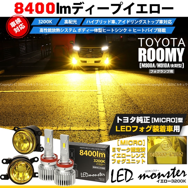 トヨタ ルーミー[M900A/M910A 後期]純正LEDフォグランプ装着車対応 Eマーク [MICRO型]イエローガラスレンズ LED MONSTER L8400 LEDフォグランプキット 全光束:8400lm LEDカラー:イエロー 3200K バルブ規格:H11(H8/H11/H16共通) |