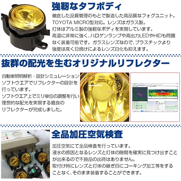 金型から設計したピカキュウオリジナルの幅細リフレクターにより抜群の配光を実現しています。イエローレンズは、装着するバルブカラーによりイエロー光の濃淡をつけることが出来ます。非点灯時も愛車の存在感をアピールします。 [1]イエローガラスレンズ仕様 [2]強固なタフボディ「アルミ製灯体」 [3]高い防塵・防水仕様「IP67」(全製品に加圧空気検査済) [4]配光調整機能搭載 [5]Eマーク認証製品 |