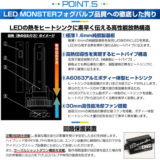明るさ全光束8400ルーメンの最強のモンスターフォグランプLEDバルブです。放熱性能が高いため、長時間点灯後も91%以上の光量を維持します。30分経過後もほとんど明るさが変化しない放熱対策を施しています。純正球の配光特性に徹底的にこだわり、理想的な配光を実現しています。 [1][ヒートパイプ構造]:熱伝導率が非常に高いヒートパイプを装備。 [2][熱伝導率の高い銅基板]:熱伝導率が高い極薄純銅製基板を採用。 [3][ボディ一体型ヒートシンク]:限られたスペースの中で最大限の表面積を得るため、ボディ一体型ヒートシンクを搭載。 [4][静音設計電動冷却ファンを搭載]:安定した放熱効果を発揮する30mm電動冷却ファン装備。 [5][サーマルシャットダウン機能を搭載]:バルブの動作周囲温度が設定値を超えた場合等の非常事態には出力を下げLEDバルブや車両の破損を防止。 [6][定電流回路搭載]:定電流回路を搭載し突発的な車両電圧変化に影響されることなく安定した点灯を確保します。 |