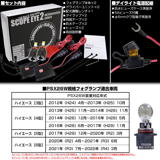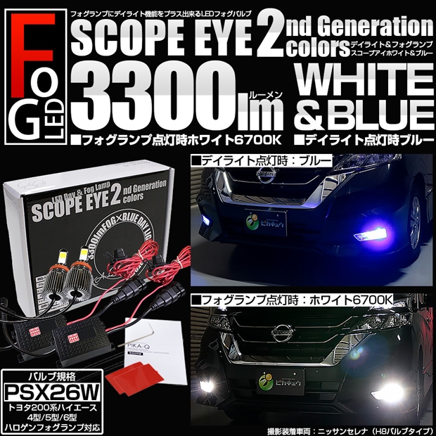 【即納】トヨタ ハイエース[200系 3/4/5/6型]PSX26W規格フォグランプ対応 SCOPE EYE 2 L3300 フォグ/デイライトLEDバルブキット 3300lmホワイト6700K/デイライト:ブルー バルブ規格:PSX26W 「おすすめ商品」