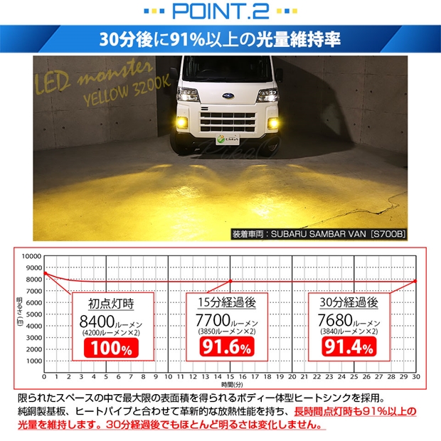 明るさ全光束8400ルーメンの最強のモンスターフォグランプLEDバルブです。放熱性能が高いため、長時間点灯後も91%以上の光量を維持します。30分経過後もほとんど明るさが変化しない放熱対策を施しています。純正球の配光特性に徹底的にこだわり、理想的な配光を実現しています。