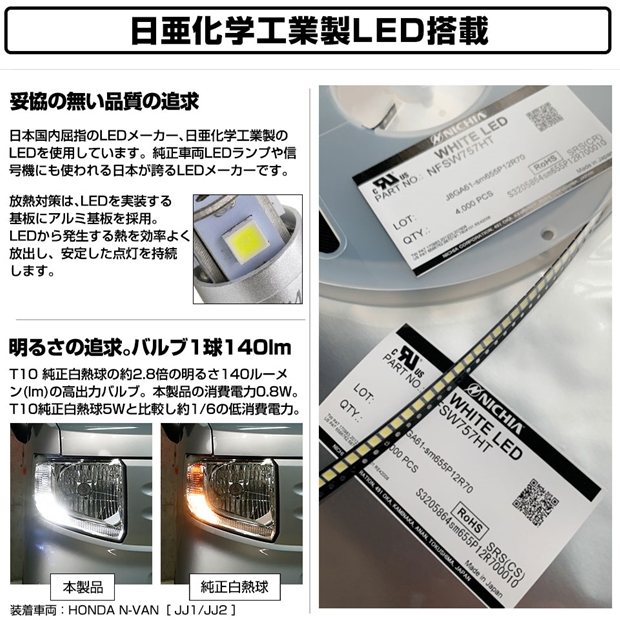 純正LEDや信号機にも使われる日亜化学工業製 3030LEDを使用。140lmの高出力でも安心してお使いいただけます。