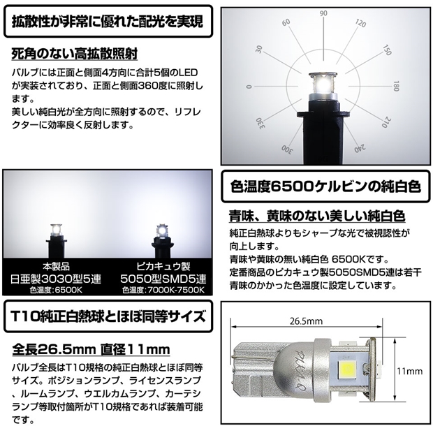 【即納】【メール便可】スバル サンバーバン[S700B/S710B]対応 ライセンスランプ用LED T10 日亜3030 5連140lm LEDウエッジバルブ LEDカラー:ホワイト 色温度:6500K 1セット1個入り