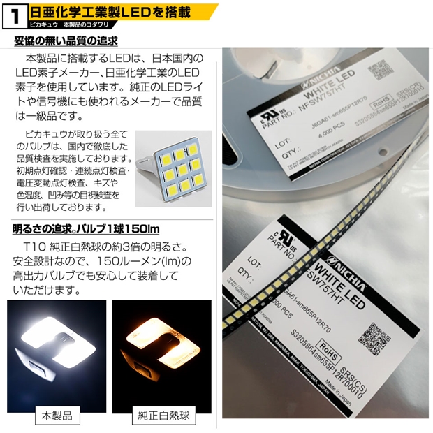 純正LEDや信号機にも使われる日亜化学工業製 3030LEDを使用。150lmの高出力でも安心してお使いいただけます。