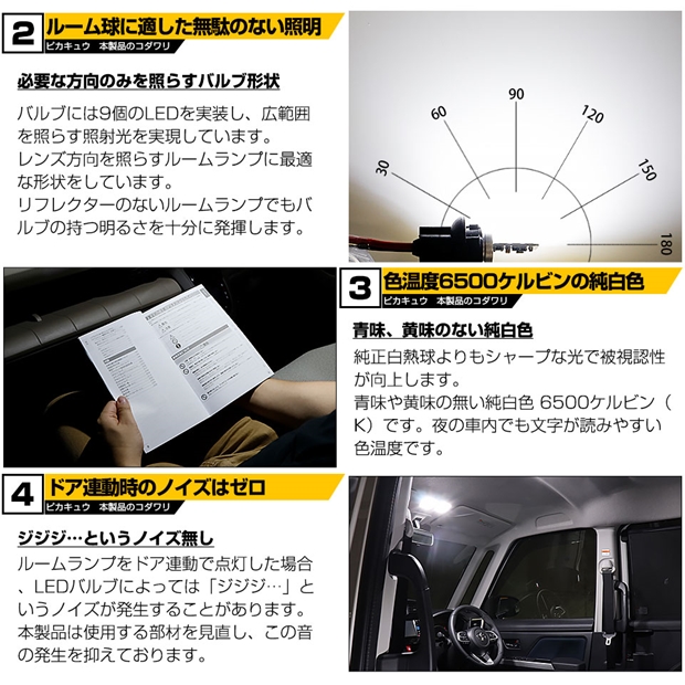 バルブには側面に合計9個のLEDが実装されており、ルームランプの必要な方向にのみ照射します。