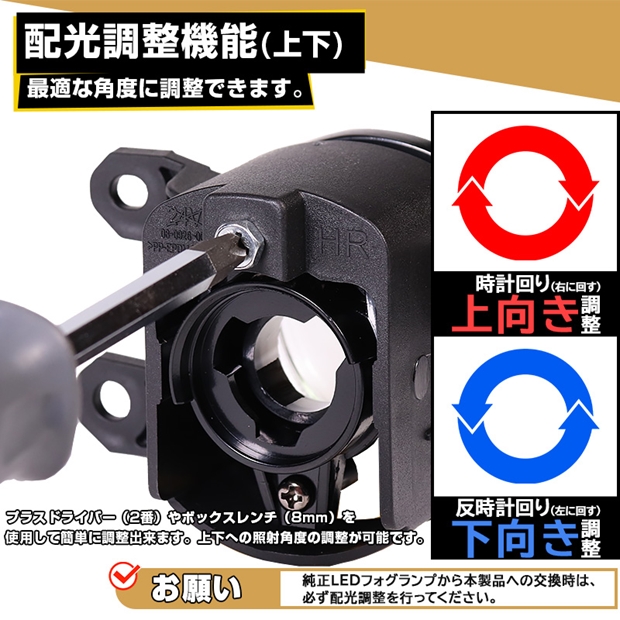 プラスドライバー(2番)やボックスレンチ(8mm)を使用して簡単に調整出来ます。上下への照射角度の調整が可能です。