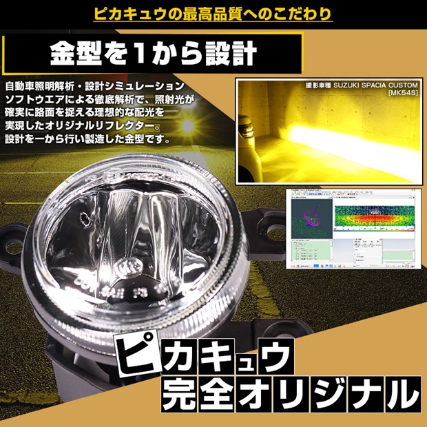 自動車照明解析・設計シミュレーションソフトウエアによる徹底解析で、照射光が確実に路面を捉える理想的な配光を実現したオリジナルリフレクター。設計を一から行い製造したピカキュウ完全オリジナルです。