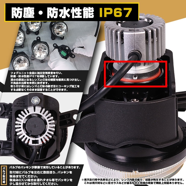 ◆バルブ取付時、バルブのパッキンが摩擦で変形することがございます。その場合フォグユニット内に水が浸入する恐れがございます。バルブ取付時にバルブを左右に数回捻り、パッキンを馴染ませてください。馴染みにくい場合はパッキンを濡れタオル等で湿らせてから取付してください。