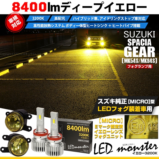 【即納】スズキ スペーシアギア[MK54S/MK94S]対応 [MICRO型]イエローガラスレンズフォグランプユニット付 LED MONSTER L8400 イエロー LEDフォグランプキットバルブ規格:H11(H8/H11/H16共通)