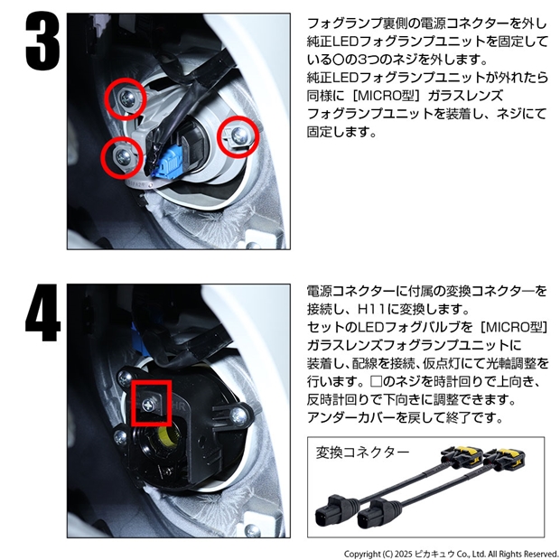 金型から設計したピカキュウオリジナルの幅細リフレクターにより抜群の配光を実現しています。イエローレンズは、装着するバルブカラーによりイエロー光の濃淡をつけることが出来ます。非点灯時も愛車の存在感をアピールします。