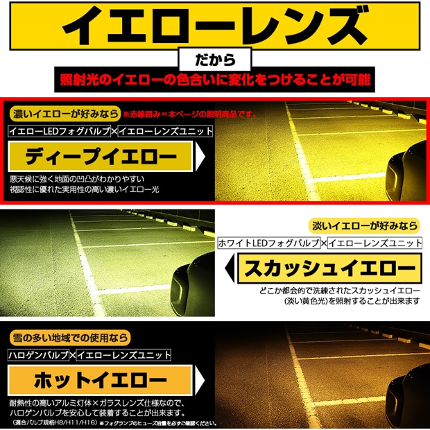 イエローレンズにLEDイエロー光を通すのでフォグの照射光は「濃いイエロー光=DEEP YELLOW」になります。イエローレンズなので非点灯時も抜群のアピール性を発揮します。