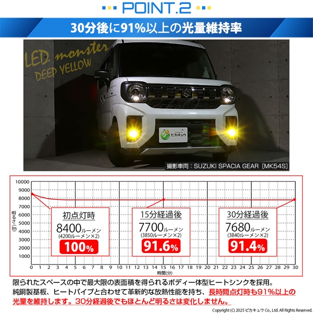 明るさ全光束8400ルーメンの最強のモンスターフォグランプLEDバルブです。放熱性能が高いため、長時間点灯後も91%以上の光量を維持します。30分経過後もほとんど明るさが変化しない放熱対策を施しています。純正球の配光特性に徹底的にこだわり、理想的な配光を実現しています。