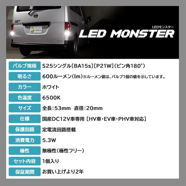 【即納】【メール便可】S25s[BA15s]LED MONSTER 600lm バックランプ用LEDバルブ ウェッジシングル LEDカラー:ホワイト6500K 無極性 1セット2個入 ¥8,690(税込) -