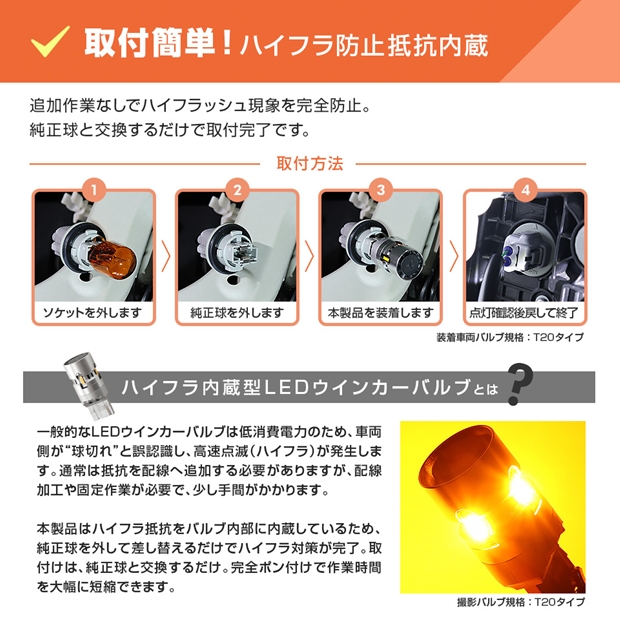 一般的なLEDウインカーバルブは低消費電力のため、車両側が「球切れ」と誤認識し、高速点滅(ハイフラ現象)が発生します。通常は抵抗を配線へ追加する必要がありますが、配線加工や固定作業が必要で、少し手間がかかります。 本製品はハイフラ抵抗をバルブ内部に内蔵しているため、純正球を外して差し替えるだけでハイフラ対策が完了。取付けは、純正球と交換するだけ。完全ポン付けで作業時間を大幅に短縮できます。