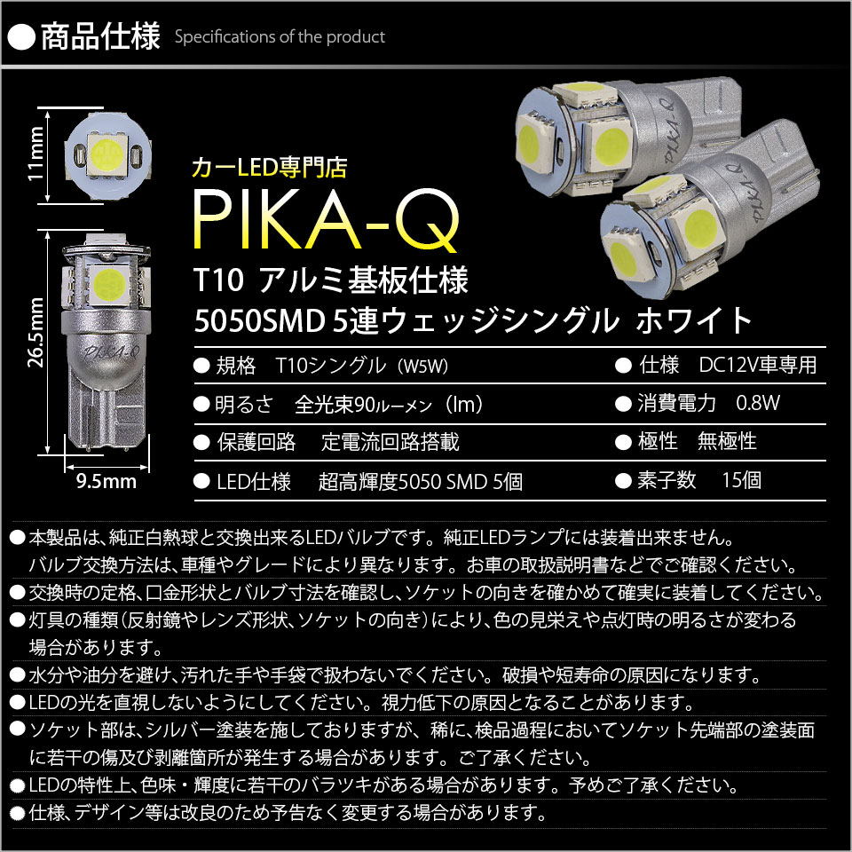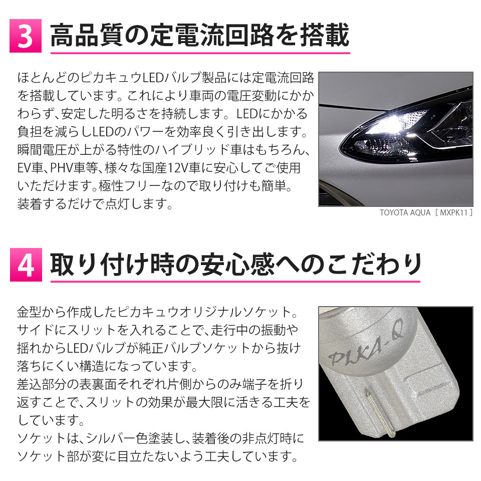 お客様に長く愛されてきたピカキュウの定番T10ウェッジバルブを最新超高輝度5050SMDにブラッシュアップしました。使い勝手の良い定番LEDバルブながら、1球の明るさは90ルーメンを実現しています。