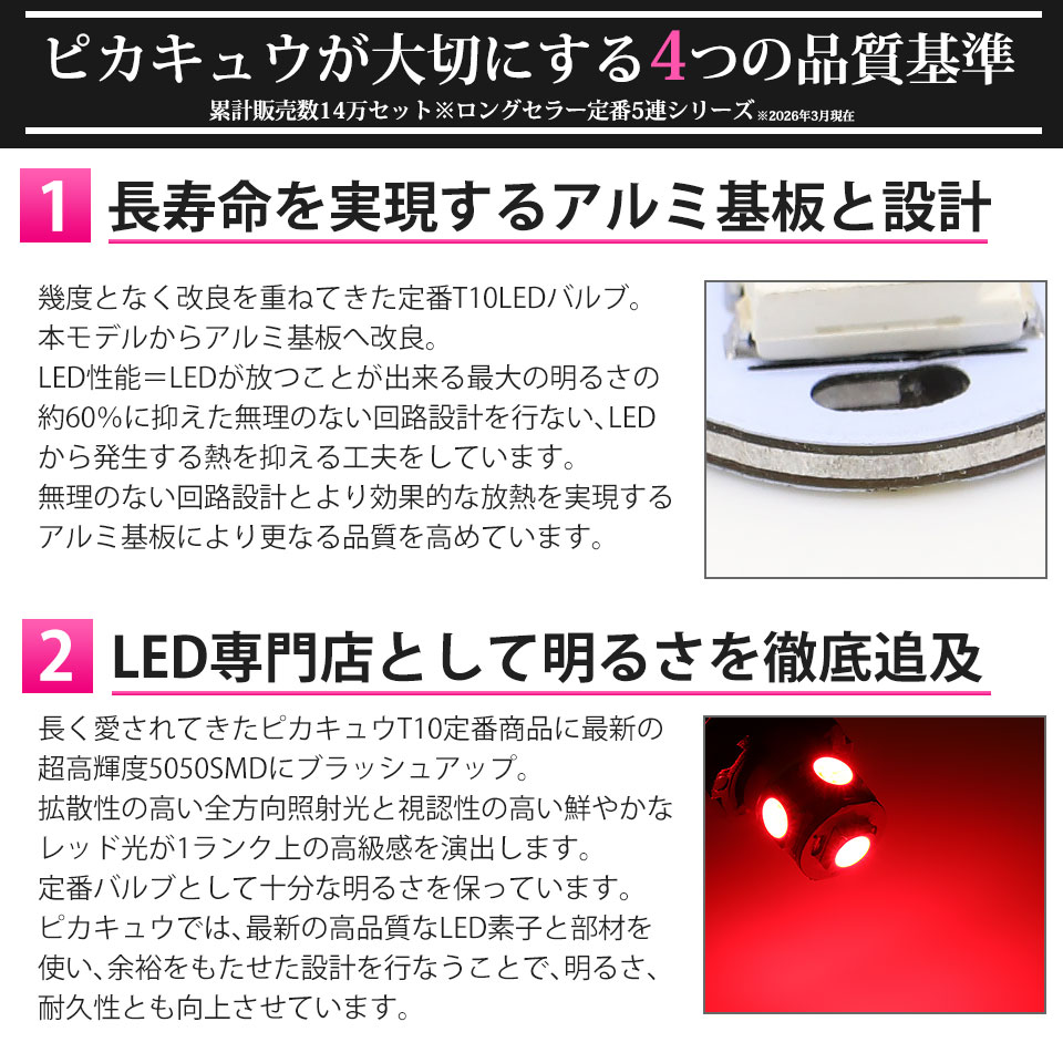 鮮やかでキレのあるレッド光が全方向に照射するのでランプユニットのリフレクターに効率よく反射します。LED専門店として明るさを徹底追及し、T10定番バルブとして十分な明るさを保っています。