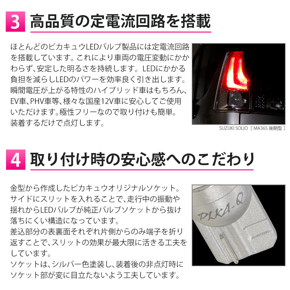 定電流回路を搭載し、車両電圧の上下に影響されることなく安定した点灯を持続します。LEDにかかる負荷を抑え、より長寿命を実現しております。 ハイブリッド車、EV車、PHV車等、さまざまな国産12V車に安心して装着していただけます。