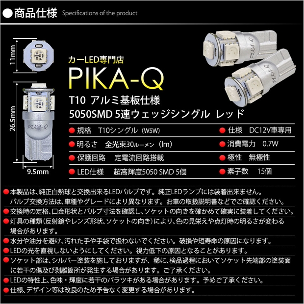 お客様に長く愛されてきたピカキュウの定番T10ウェッジバルブを最新超高輝度5050SMDにブラッシュアップしました。使い勝手の良い定番LEDバルブながら、1球の明るさは90ルーメンを実現しています。